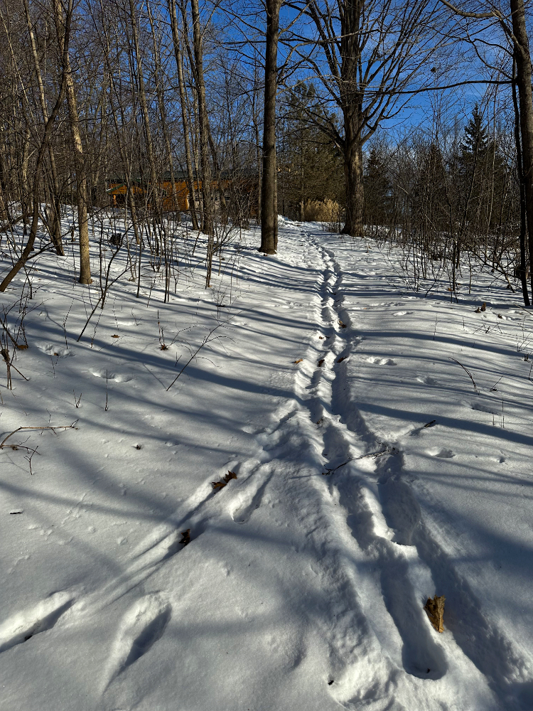Not that darkness is the only time he faces temptations to chase prey. The rabbits have been plentiful this year, and he is more than happy to race after them at every opportunity. They are creating well-worn trails in the snow toward the barn overhang, where there is an endless supply of spilled senior horse food pellets to eat.