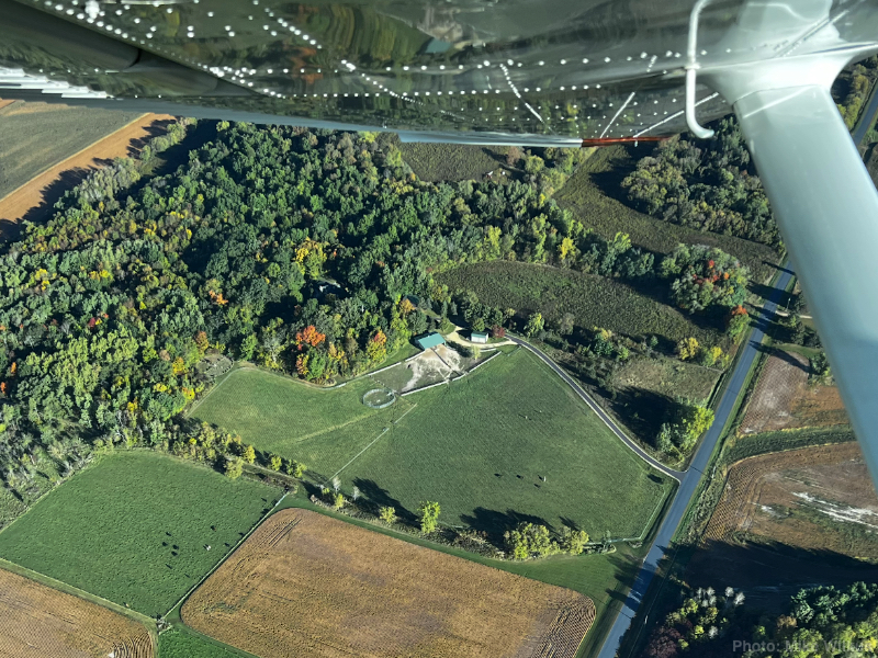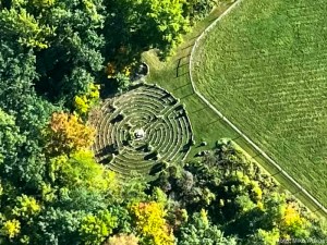 We were finishing breakfast yesterday morning when our friend, Mike Wilkus, texted that he and his niece would be flying over our place in twenty minutes. Cyndie responded that we would be out in our field with the horses and asked for a photo of the labyrinth. Right on time, we heard the sound of a small plane approaching.