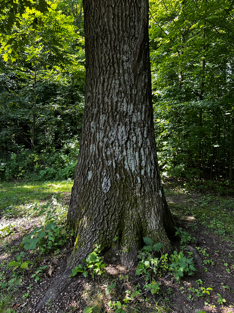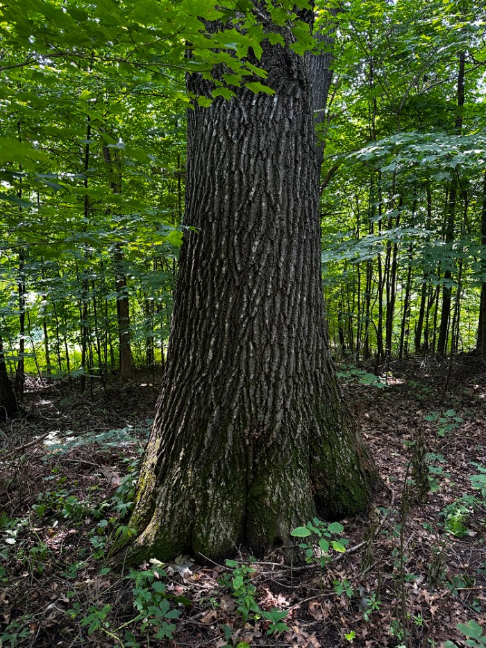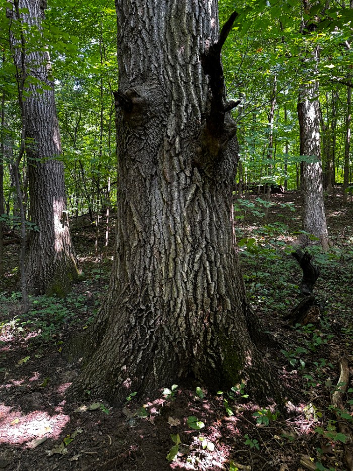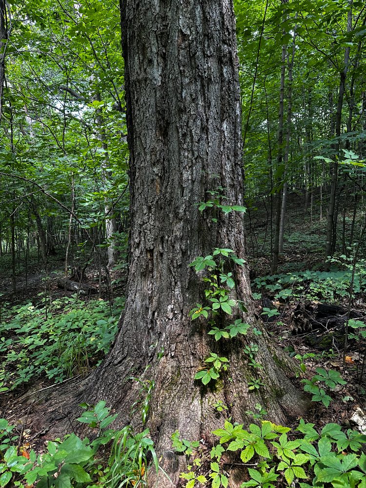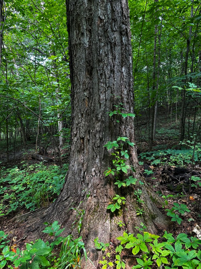 The eighth tree is also a maple. It is located just beyond the bird-pecked tree, near what we call the “Middle Trail.” There isn’t anything particularly distinguishing about this tree but its girth caught my eye and earned it a spot in the survey. Deservedly so. I left the vine in place for the photo to show what we need to constantly address. I uprooted it and pulled it off the bark immediately after taking the picture.