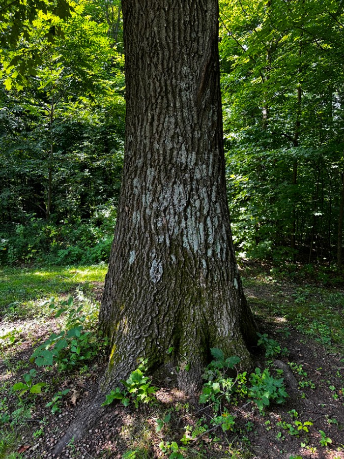 The ninth tree brings us back to the oaks again. It also brings us back to the crown jewel tree I’ve already made a reference to in an earlier post. It is the tree we are calling the Mother Tree. It is deserving of another look. A year ago this tree dropped so many acorns we started referring to the trail that passes beneath it as “ball bearing alley.”