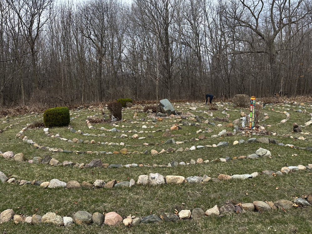 We had spent an afternoon sprucing up the labyrinth in preparation for their visit, trimming bushes, re-balancing stones, and removing accumulated leaves.