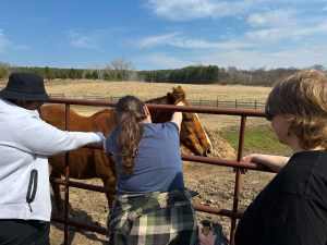 After the five guests finished walking the labyrinth, they made their way to see the horses, where we were rewarded in several more ways. First off, simply the fact that the horses were in a very social mood all day was a big plus. The horses rarely seem bothered by groups of talkative strangers and all the added energy they bring.