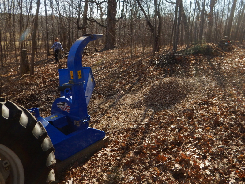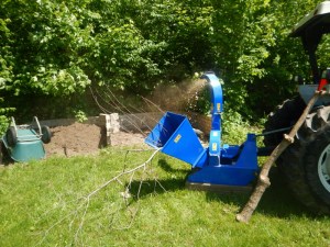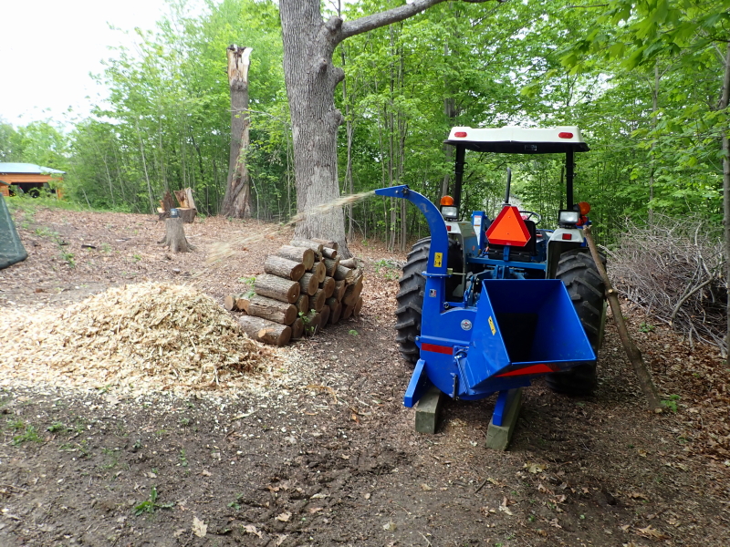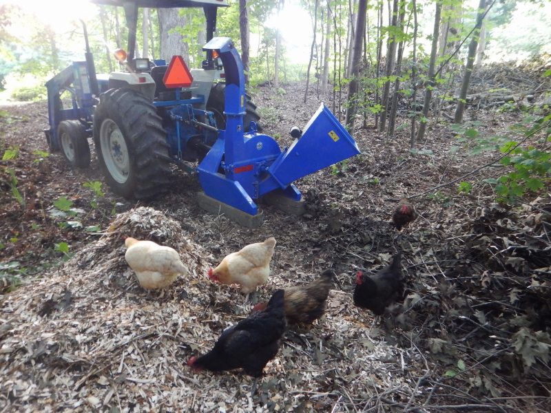 It is relatively easy to set up, makes good use of our otherwise under-utilized diesel tractor, and it makes quick work of the chipping. I love the way it transforms an unsightly nuisance of constantly accumulating dead (or recently pruned) branches into a precious resource of wood chips. We will never have enough.