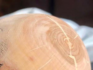 When it comes to a polished wood sculpture, my feelings are just the opposite. I can’t quit until tool marks are gone. At least, on the primary features, anyway. I grant myself some leeway where my design transitions from the rough unfinished bark to the smoothly shaped and polished wood grains.