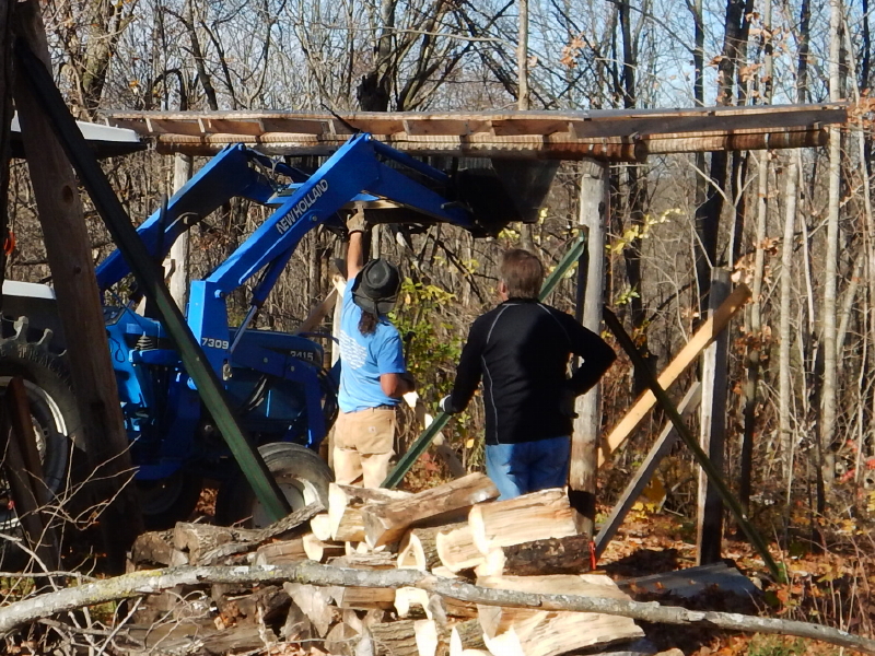 I’m happy to report that my idea of using the loader bucket on the tractor to lift the roof into place worked wonderfully. It was not without a few precarious moments, but we avoided disaster and successfully set it in place on the posts. It was interesting for me to see the forces in play as we moved and positioned the roof on the posts. Having the benefit of Mike’s architectural expertise and his practical experience proved to be a priceless asset for my peace of mind as the project proceeded.