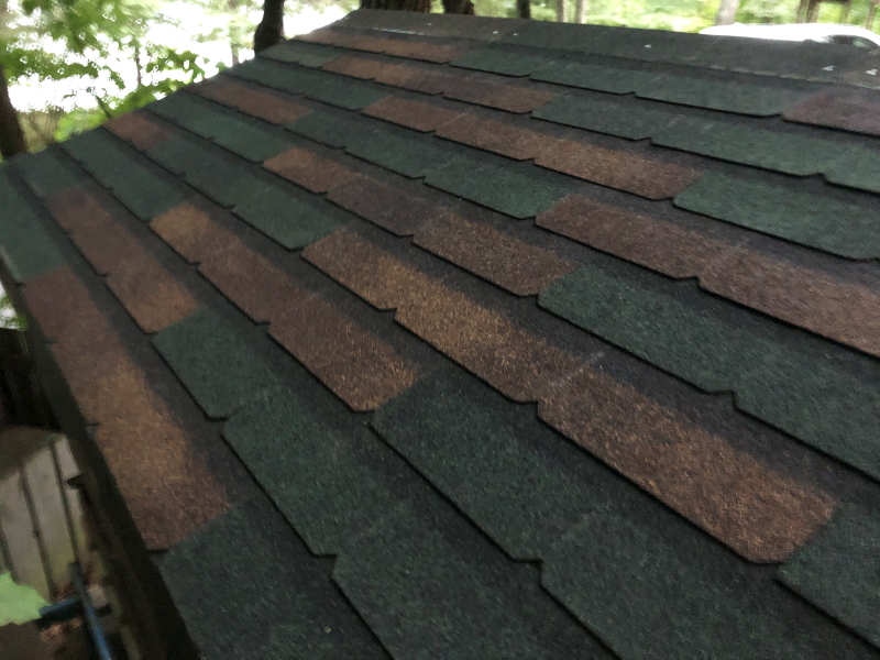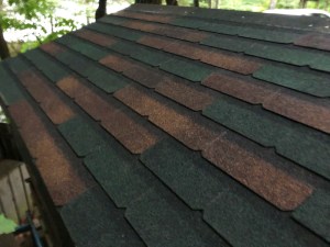 After leaving work early yesterday in order to ride up to the lake with Cyndie’s mom, we made quick work of slapping some shingles on the woodshed before the impending rain arrived. While still in the car, I watched a refresher video about shingling a roof. Then, I immediately disregarded the details about properly staggering the rows and made it up randomly as I went along.