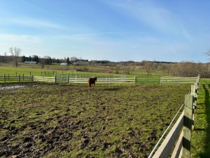 Mia was showing a Zen-like focus on the acres beyond the paddock fence this morning. Even though it is sunny today, it is way too wet to be walking on our turf, as can be seen in the amount of hoof-traffic abuse the surface inside the paddock is suffering. The poor horses can’t help damaging the very grass they would love to be eating.